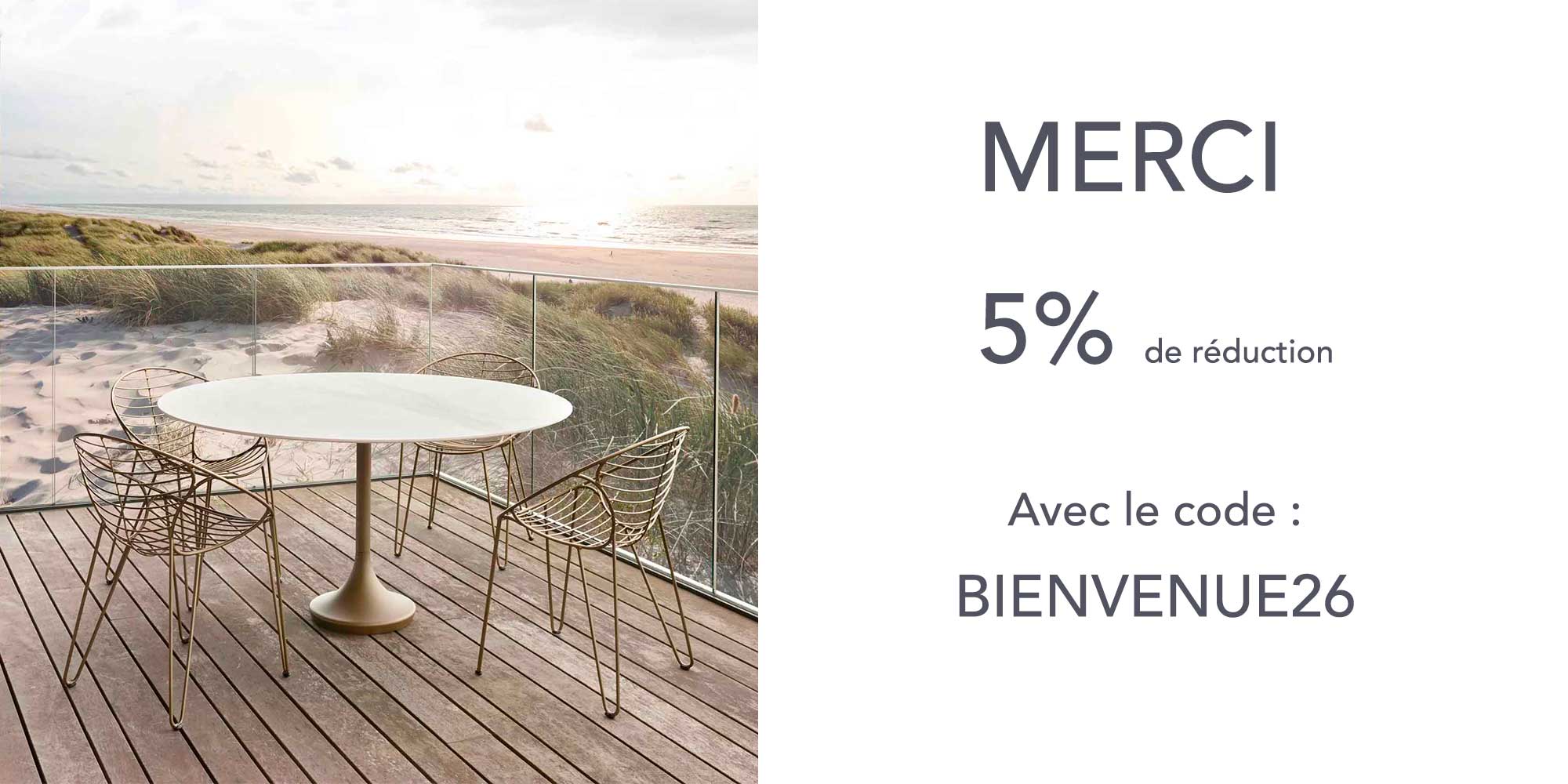 Conditions de l’offre : 5% offerts hors frais de port et hors luminaires. Offre non cumulable avec toute autre offre en cours ou à venir. Réduction à usage unique.