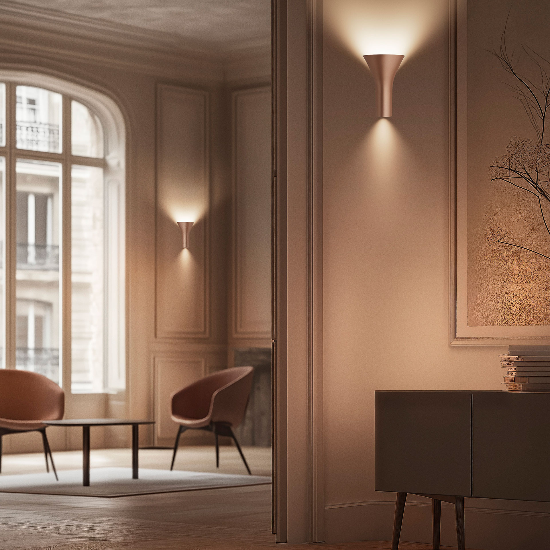 Sa forme compacte en métal satiné semble flotter légèrement à la surface, diffusant une lumière indirecte vers le mur et le plafond tout en projetant un faisceau doux vers le bas. La source lumineuse reste subtilement dissimulée pour garantir un confort visuel optimal. Disponible en plusieurs finitions, Torche apporte une touche sophistiquée et intemporelle.
