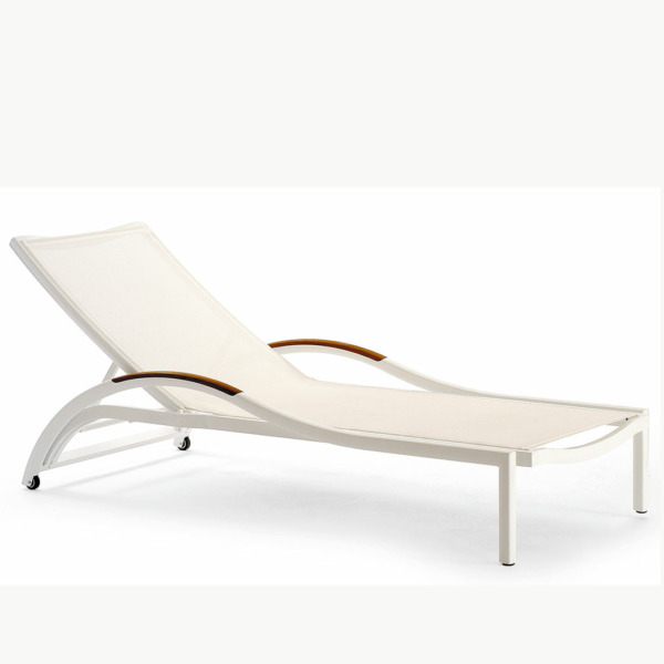 Les accoudoirs en teck créent un contraste original avec la structure blanche en aluminium laqué.