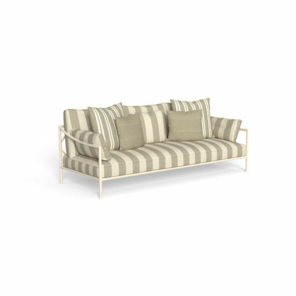 Le canapé Capri de Talenti combine élégance et confort dans un design contemporain. La structure en métal thermo-laqué semi-gloss lui confère un aspect sophistiqué et moderne, tout en garantissant stabilité et durabilité. Le revêtement du canapé est en tissu outdoor couleur naturelle, avec une texture douce et confortable qui s’adapte à tous les styles d’ameublement.