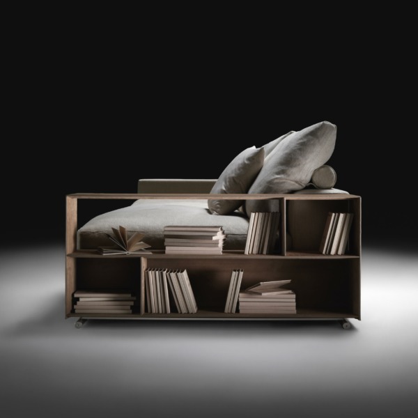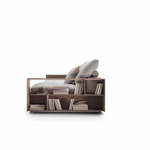 C’est ainsi qu’est née la brillante idée de repenser le concept d’accoudoir qui, pour le canapé Groundpiece, peut être rembourré ou consister en un meuble à étagère en métal recouvert de cuir sellerie, utile et pratique pour y poser et y ranger des objets.
