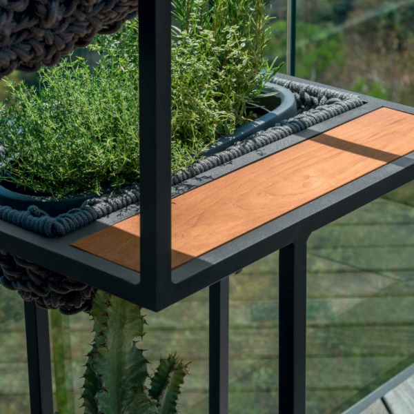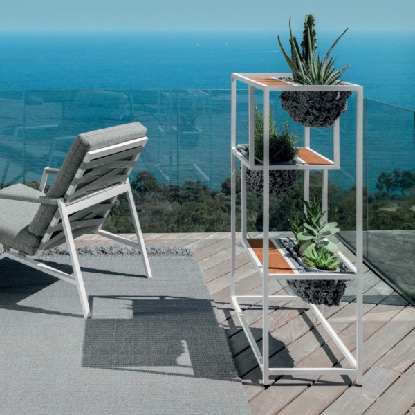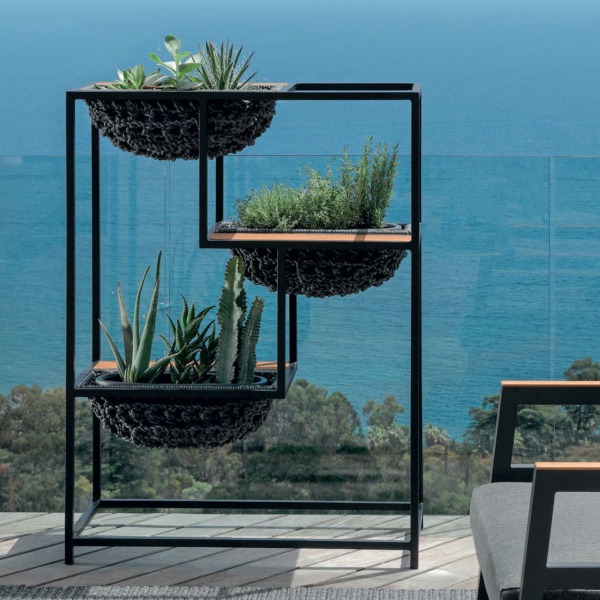 La jardinière Jackie de Talenti se compose d’ une structure en aluminium thermolaqué, vient accueillir 3 paniers en corde nautique et de planches en teck. Son format original et élégant en fait aussi une séparation de pièce atypique.