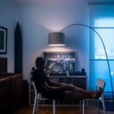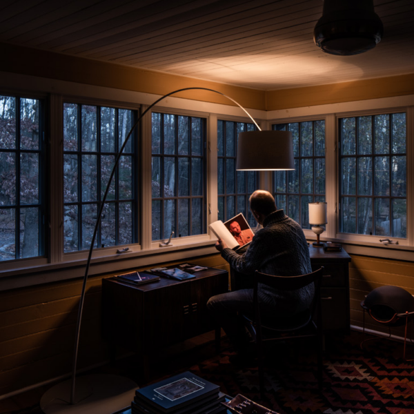 Il permet un éclairage au sol, mais aussi au plafond grâce à un disque transparent dans sa partie supérieure.