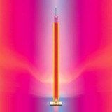 Déjà remarquable lorsqu’elle est éteinte, cette lampe-sculpture irradie l’espace vers le haut une fois allumée. La source de lumière est cachée dans la base et la lampe est fixée sur un support réfléchissant qui permet de décupler l’impression de verticalité et les effets lumineux.