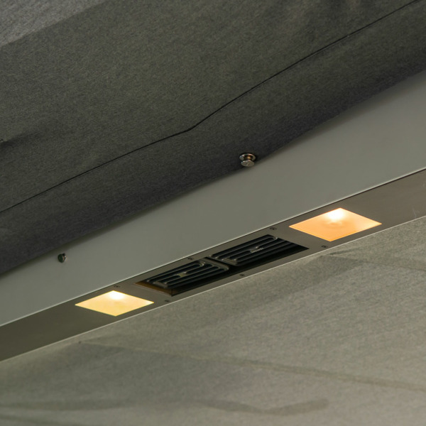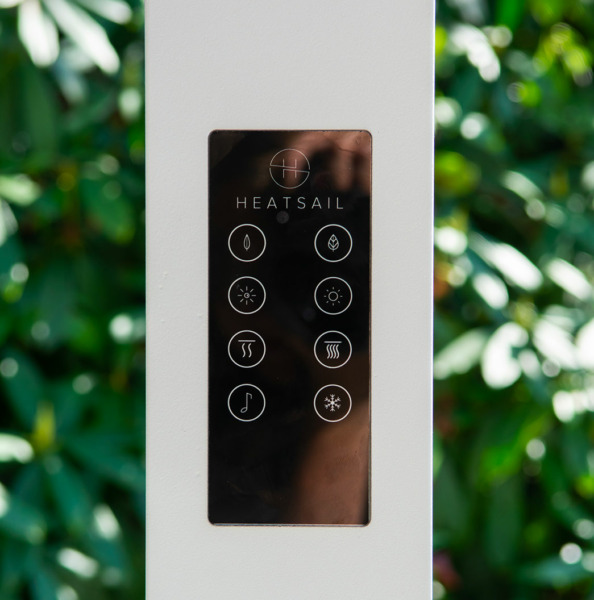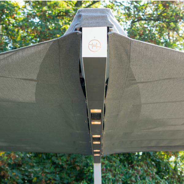 Le LEAF s’ouvre et se ferme d’une simple pression du doigt. S’il y a trop de vent, il détecte la vibration et se ferme. Ouvert, il a une surface de 4,6 sur 3,6 mètres et vous pouvez le faire pivoter de 360 °. L’écran tactile intégré vous permet de varier les 6 points lumineux. Des éléments chauffants infrarouges sont répartis sur la longueur du LEAF. Différents positions de chaleur sont possibles.
