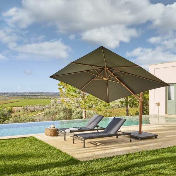 Les parasols déportés de sont disponibles dans un large choix de coloris de toile en tissus acrylique teinté en masse lavage en machine à l’eau froide (laine) – séchage à l’air.