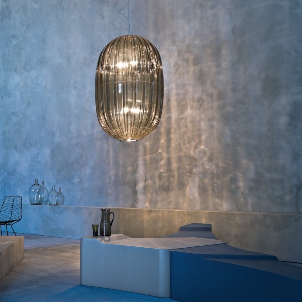La suspension Plass de Foscarini éclaire par une lueur interne qui se reflète sur sa surface gravée, la matière brille comme du cristal et donne naissance une trame de jeux lumineux. Les coloris bleu et gris font directement référence au verre de Murano et à l’artisanat vénitien.