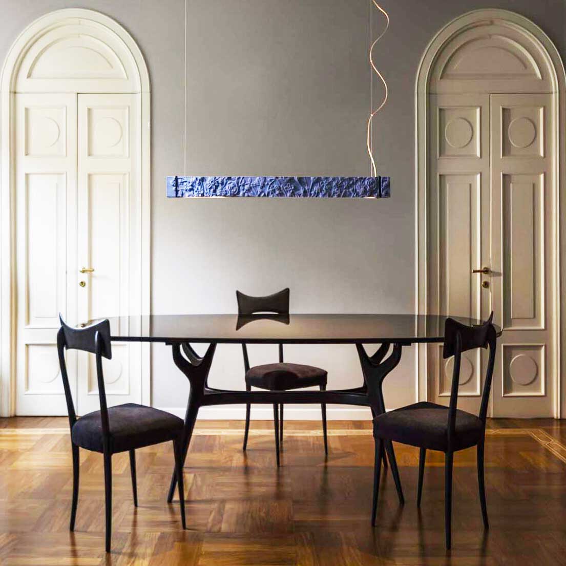 La suspension Fregio de Foscarini est une sculpture lumineuse construite sur une synthèse des oppositions : entre l’ombre et la lumière, les pleins et les vides, entre la saveur ancestrale de la céramique émaillée décorée à la main et la saveur technologique et industrielle des sources lumineuses LED et des bandes de métal qui les soutiennent. Elle émet beaucoup de lumière vers le bas et vers le haut et constitue une suspension parfaite pour éclairer une table.