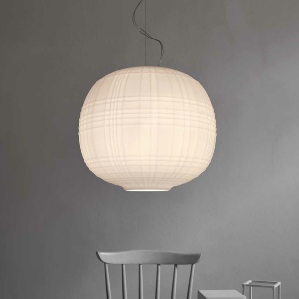 La suspension Tartan LED est avant tout une création très personnel des designers Ludovica + Roberto de Foscarini. Le verre soufflé permet un effet visuel notamment grâce à une technique particulière de soufflage à la bouche. La suspension est caractérisée par des lignes et des plis qui parcourent toute la surface, un jeu graphique très original d’ombres et de lumières, qui rappellent la trame du tissu écossais. Tartan répand une luminosité chaude et tamisée dans l’environnement, filtrée par le verre opalin qui garantit aussi un bon éclairage orienté vers le bas. On aime ce luminaire à la présence pure et graphique.