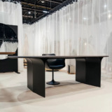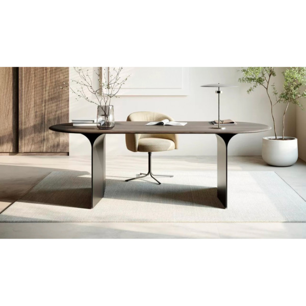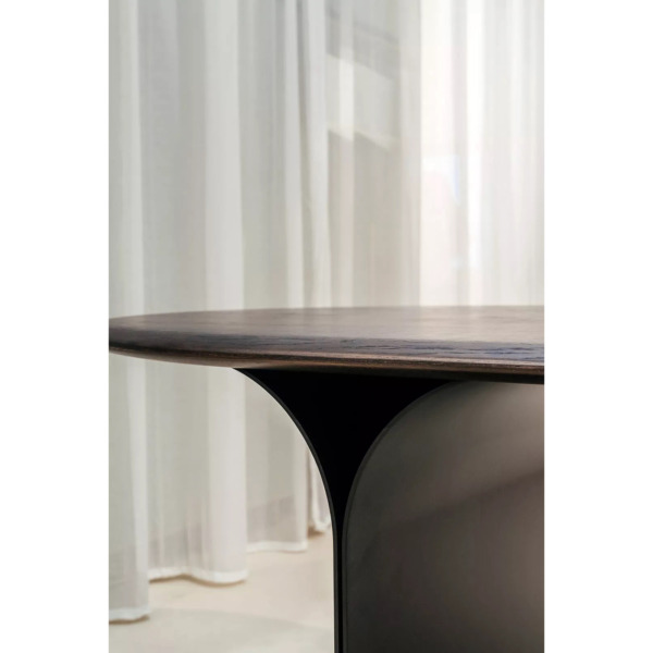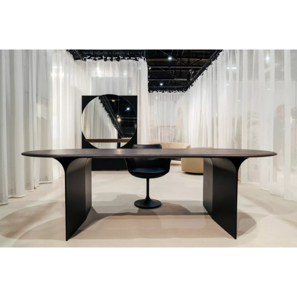 La table Arcs en bois de chêne massif de 32 mm avec un piètement en aluminium thermolaqué, présente une esthétique singulière et chaleureuse qui crée immédiatement une atmosphère naturelle et accueillante dans votre espace de vie.