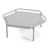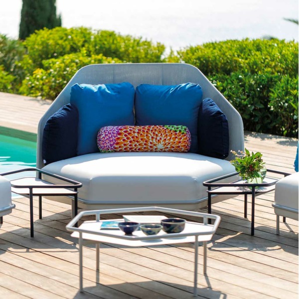 La table basse et la demi-table Hive hexagonales sont créés en collaboration avec le célèbre designer Fabrice Berrux de EGO Paris. Elles présentent un design original en aluminium laqué qui les rend particulièrement adapté aux environnements extérieurs et s’insèrent parfaitement dans les diverses compositions.