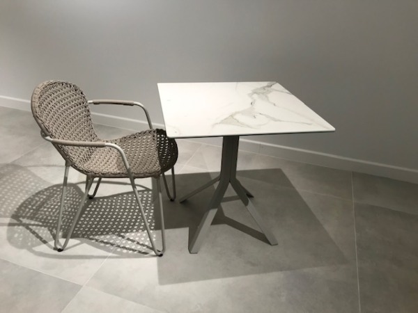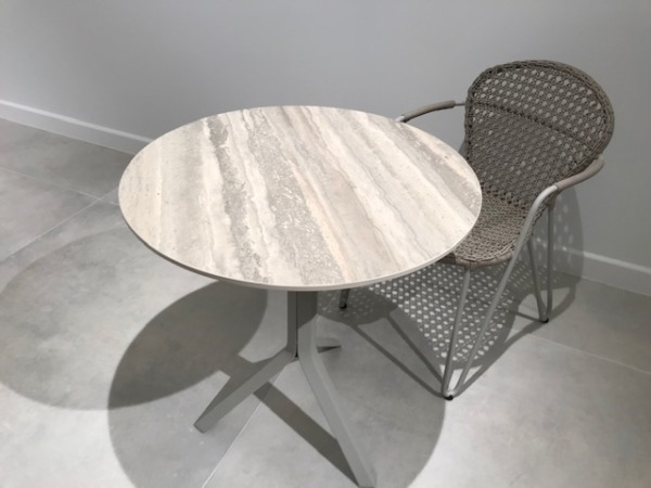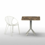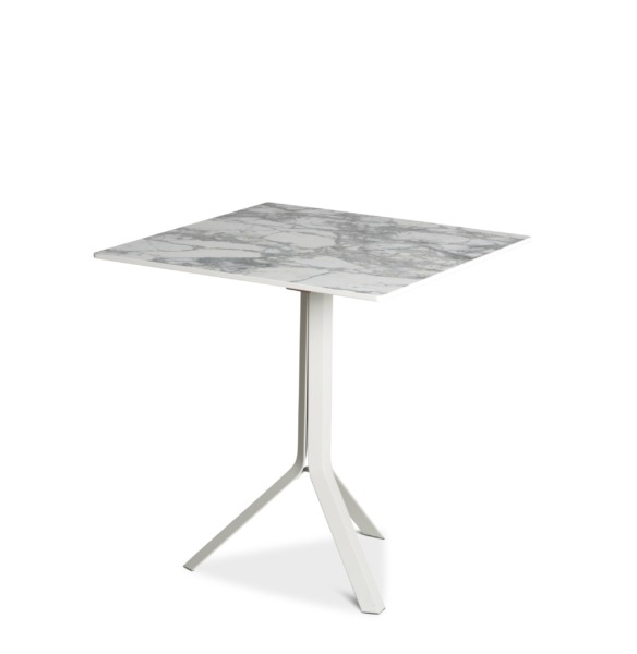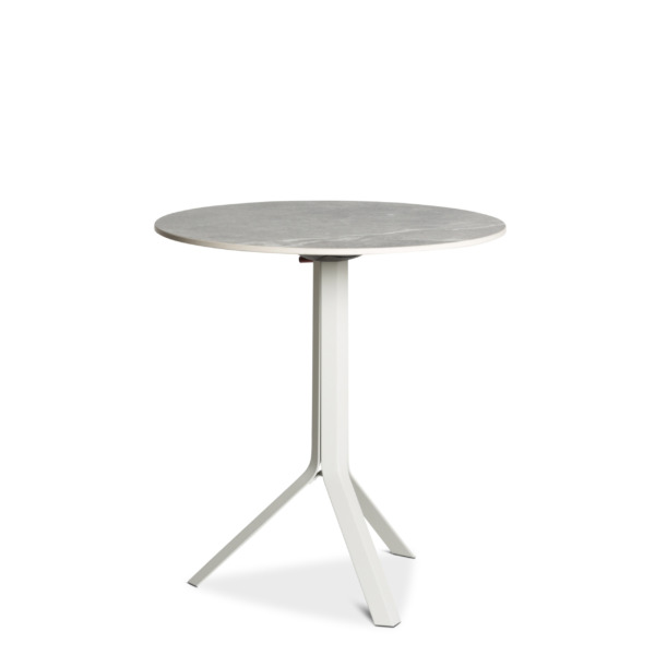 Le piétement Fizz avec trois pieds possède un click système (son plateau en céramique se plie et se lève grâce à une poignée située sous la table, ce qui vous permettra de la ranger plus facilement) uniquement pour les plateaux rond diamètre 70 et 80 cm ou carré 70 x 70 cm