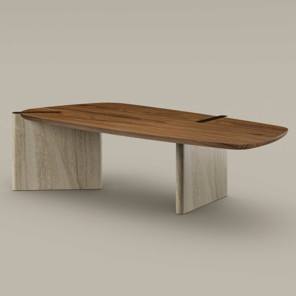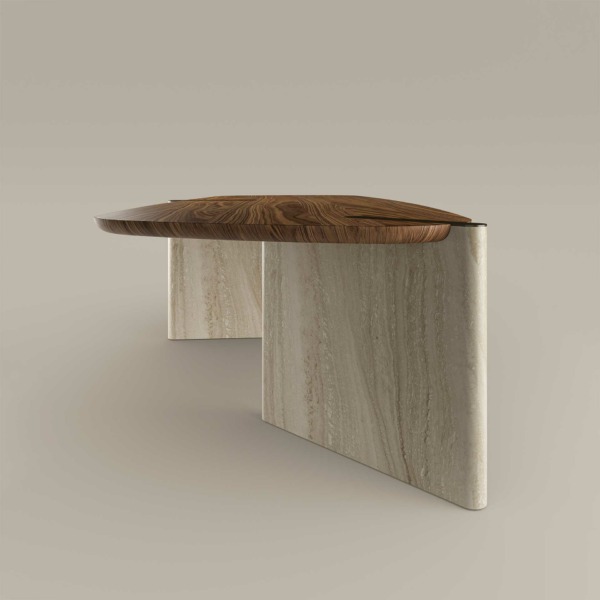 Double Material : base en marbre associée à un plateau en bois.