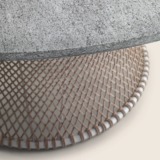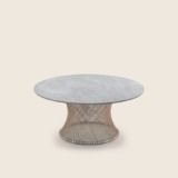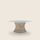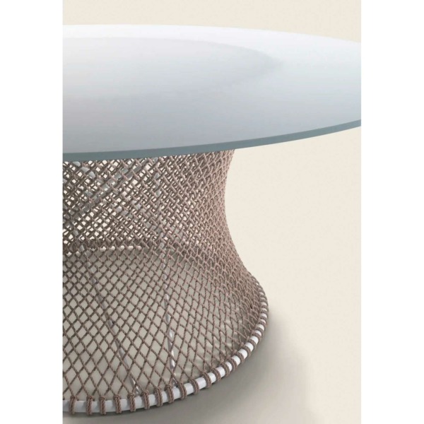 La particularité de la table Oasis de Flexform réside dans la base d’un tube métallique thermolaqué époxy recouvert d’une tresse entièrement faite à la main en polypropylène ou en corde de caoutchouc.