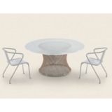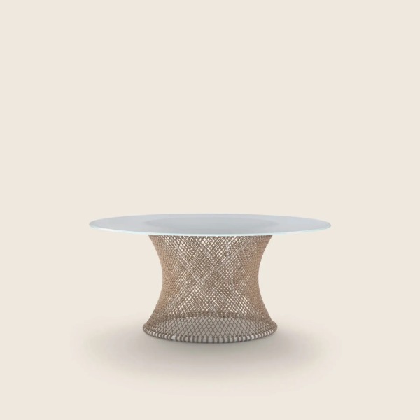 Un motif en maille tissée légère, une structure métallique et un plateau en verre trempé créent un design à la fois élégant et léger conçues pour créer des espaces extérieurs avec une attention aux détails.
