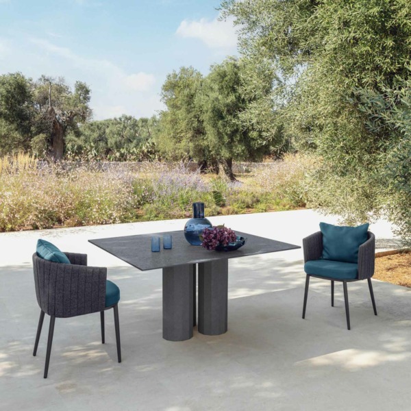 La table à manger Salinas est une table rectangulaire ou ronde conçue par Ludovica + Roberto Palomba pour la marque Talenti. La texture du béton offre une résistance extraordinaire. Le style raffiné, souligné par les 4 colonnes classiques qui le soutiennent, offre une solution de continuité entre le mobilier d’intérieur et d’extérieur.