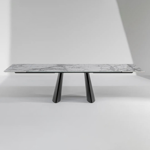 La table extensible Torii de Bonaldo, a un caractère à la fois sophistiqué et moderne. Le plateau est réalisé en céramique haut de gamme ou en bois de chêne ou noyer. Sa base sculpturale en métal thermolaqué, permettant une obstruction minimale et maximisant l’espace sans perdre la solidité.
